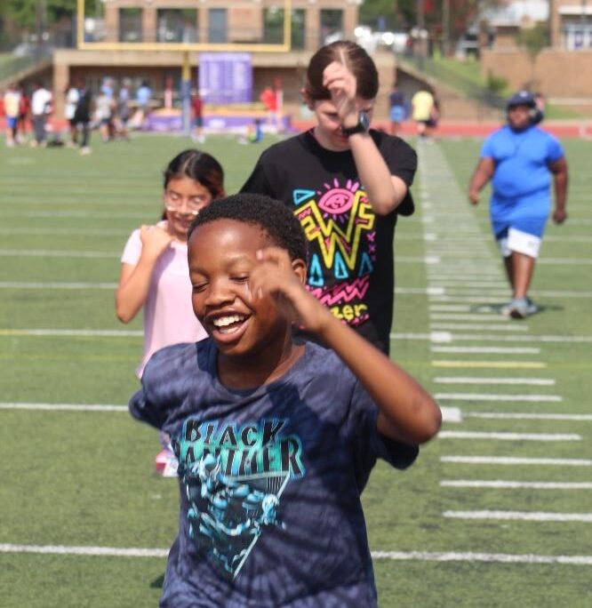 After breakfast, the track portion of our program starts. The camp moves down to the turf fields at CBHS and campers go through a 20 minute warmup routine together. Then, they rotate between three track oriented stations, each focused on an event grouping.